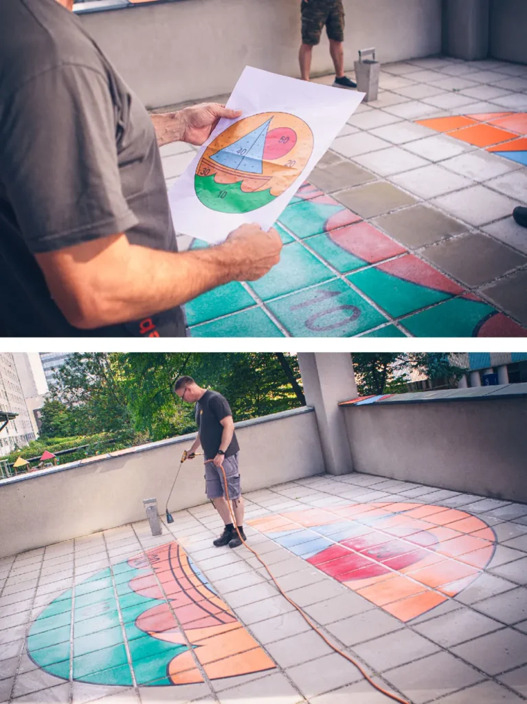 Kreative Spiele, Lernflächen und bewegungsfördernde Markierungen für Schulen, Gemeinden und Freiräume.