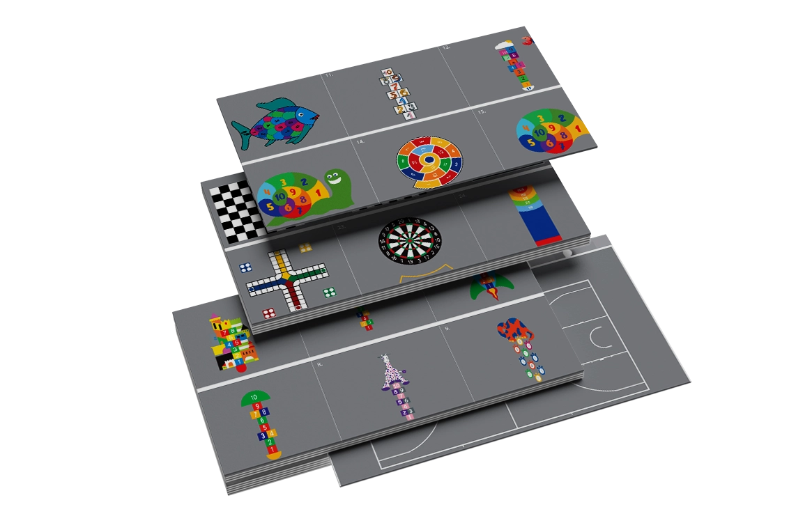 Dazu gehören unter anderem: Hüpfspiele in vielen Varianten Spiel- und Sportflächen wie Schach, Ludo, Zielscheiben oder Bewegungsparcours Lernspiele mit Zahlen, Buchstaben, Uhr, Weltkarte oder Sonnensystem Verkehrsspielflächen für spielerisches Lernen im Straßenverkehr Linien, Formen und farbige Gestaltungselemente für individuelle Flächenkonzepte